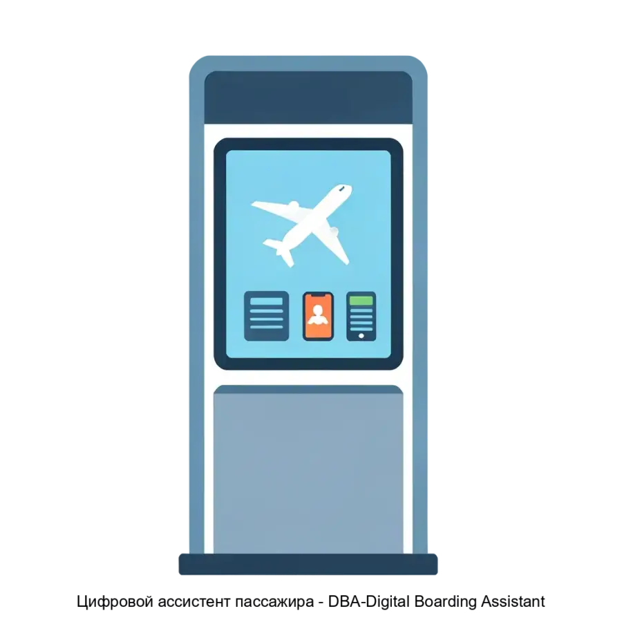 Цифровой ассистент пассажира DBA-Digital Boarding Assistant представляет собой устройство, предназначенное для обеспечения пассажиров актуальной информацией в аэропортах. Он действует как информационный киоск для вылетающих пассажиров и интегрируется в систему позиционирования и контроля количества пассажиров в различных зонах аэропорта.