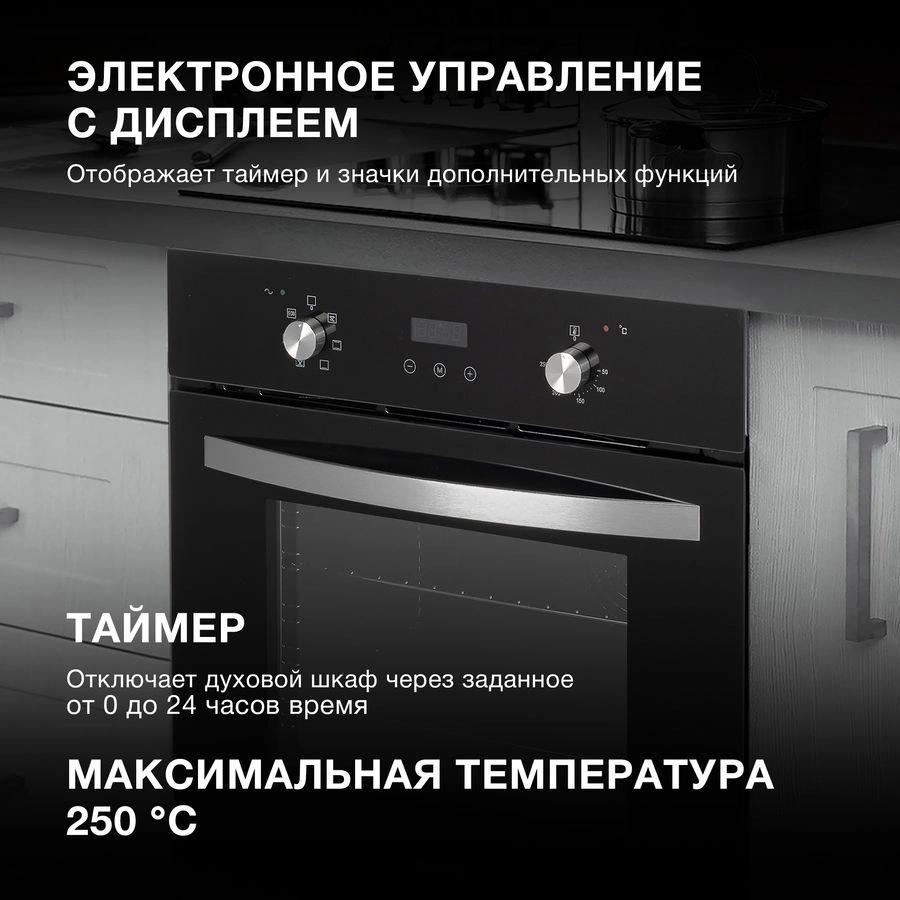 Габариты встроенного пространства составляют 56×56.5×60 см, что делает данную модель подходящей для стандартных кухонных шкафов. Общий объем духовки равен 68 литров, чего достаточно для приготовления как небольших блюд, так и больших объемных угощений. Мощность подключения составляет 2300 Ватт, что обеспечивает быстрый нагрев и стабильную работу устройства. Максимальная температура достигает 250℃, предоставляя возможность готовить широкий спектр блюд — от запеканок и пирогов до жаркого и бисквитов.