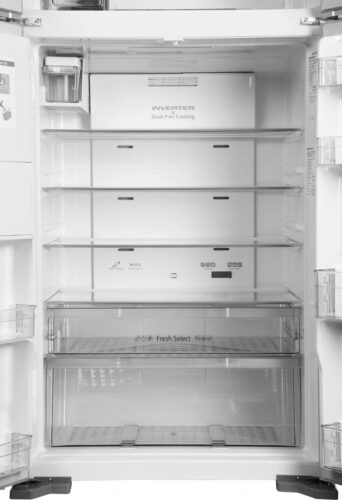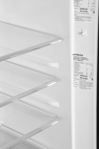 Управление холодильником Hitachi осуществляется с помощью электронной панели, с визуальной индикацией отключения электропитания, звуковыми сигналами при незакрытой двери и контролем температуры, что обеспечивает удобство и безопасность эксплуатации. Внутри холодильника расположено 4 стеклянные полки, 2 ящика, а также 6 полок на дверцах, что позволяет грамотно организовать пространство и распределить продукты.
