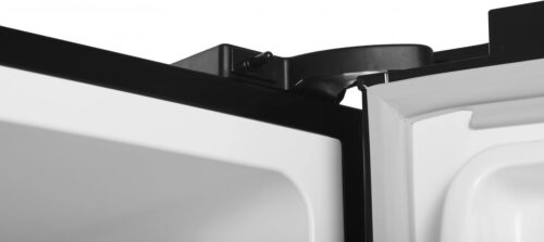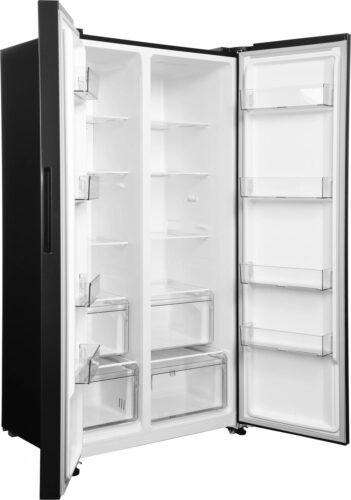 Особенности конструкции включают: элегантный черный матовый корпус, удобные полки из прочного стекла с регулировкой высоты, вместительные ящики для хранения овощей и фруктов, а также специальные отделения для бутылок и яиц. Вместимость холодильника обеспечивает удобное хранение продуктов для семьи среднего размера.
