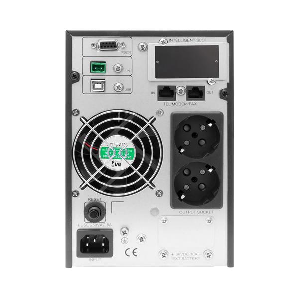 Время перезарядки аккумуляторных батарей составляет около 3 часов, что позволяет быстро восстановить резервные возможности после разряда. В комплект включены 4 предварительно установленных аккумулятора, что гарантирует надежную работу устройства в течение долгого времени. Вес ИБП составляет 18 кг, что при его функциональности и мощности считается умеренным балансом. Цвет корпуса — черный, что способствует его гармонии в офисных и серверных помещениях. Устройство оснащено многофункциональной панелью управления с ЖК-дисплеем, позволяющей администраторам контролировать состояние системы в реальном времени и получать важную информацию о работе, а также управления с помощью интерфейсных портов RS232, USB и SNMP слота. Наличие функции аварийного отключения питания (EPO) обеспечивает безопасное прекращение работы системы в чрезвычайных ситуациях. Устройство предназначено для стационарной установки на полу, что обеспечивает устойчивость и удобство обслуживания.