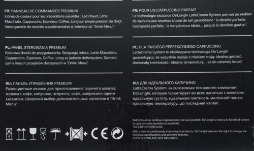 Резервуар для воды большой емкости – 2 литра, а отдельный контейнер для молока вмещает 400 мл, что позволяет готовить напитки с молочной пеной без дополнительного вмешательства. Автоматический капучинатор с регулировкой подачи пара и горячей воды обеспечивает быстрое приготовление капучино, латте макиато и других кофейных шедевров. Высоту регулировки дозатора можно изменять, чтобы использовать разные по размеру чашки объемом от 20 до 250 мл, а подсветка чашек добавляет визуального комфорта при использовании аппарата в темное время суток.