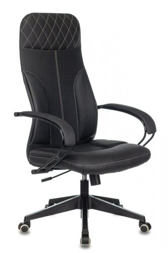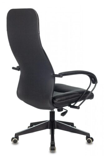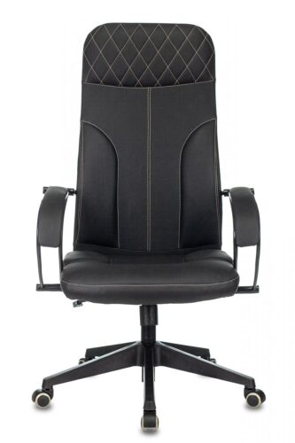 Основным материалом обивки является высококачественная искусственная кожа (экокожа) черного цвета, которая легко чистится и отличается долговечностью. Спинка кресла также выполнена в черном цвете, создавая единый стиль. Подлокотники кресла оснащены мягкими накладками, повышающими комфорт при работе. Кресло установлено на пластиковую крестовину с колесиками, обеспечивающими мобильность и легкость перемещения по рабочему пространству. Колеса имеют накладку из полиуретана (PU), что делает их более тихими и безопасными для напольных покрытий.