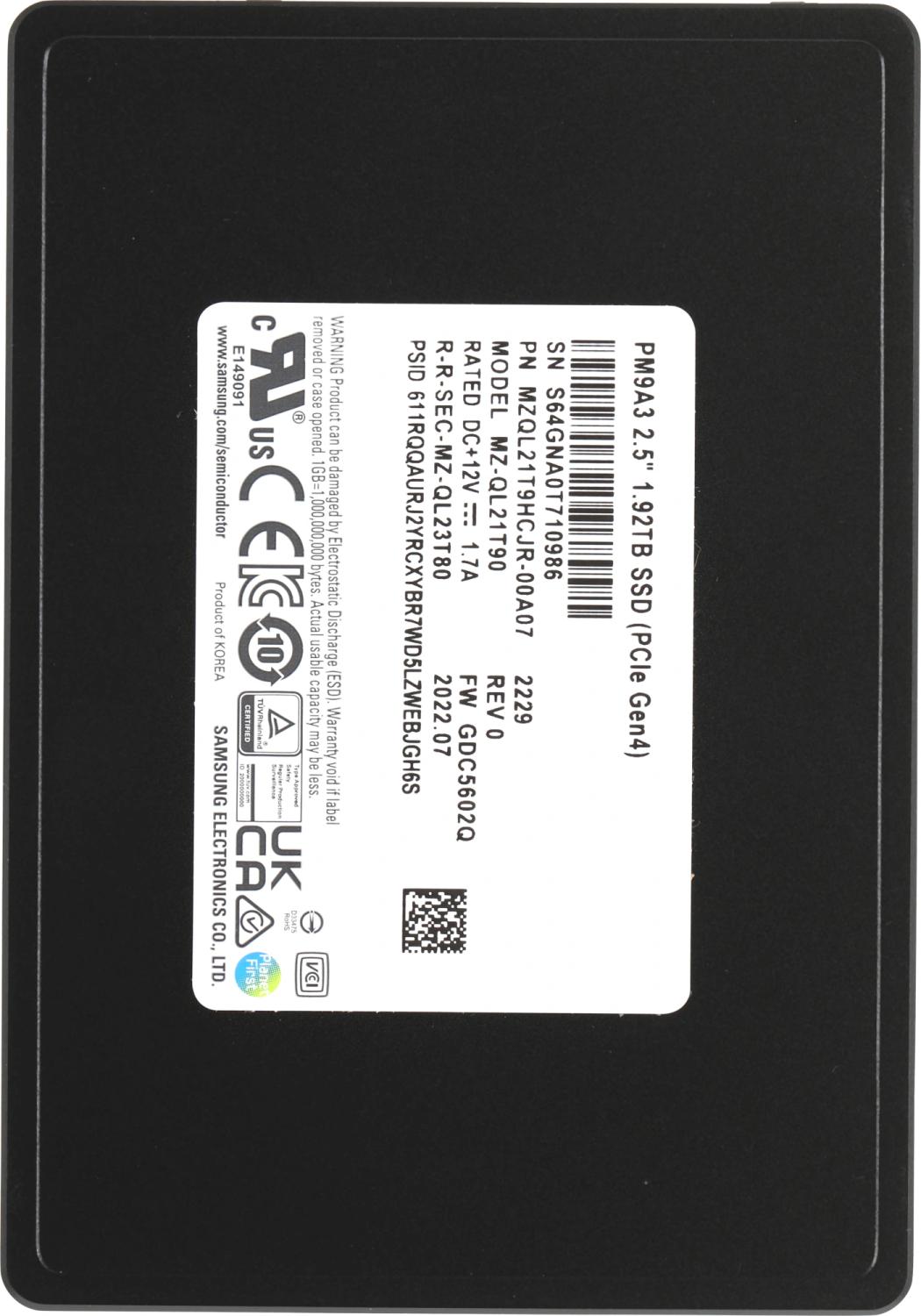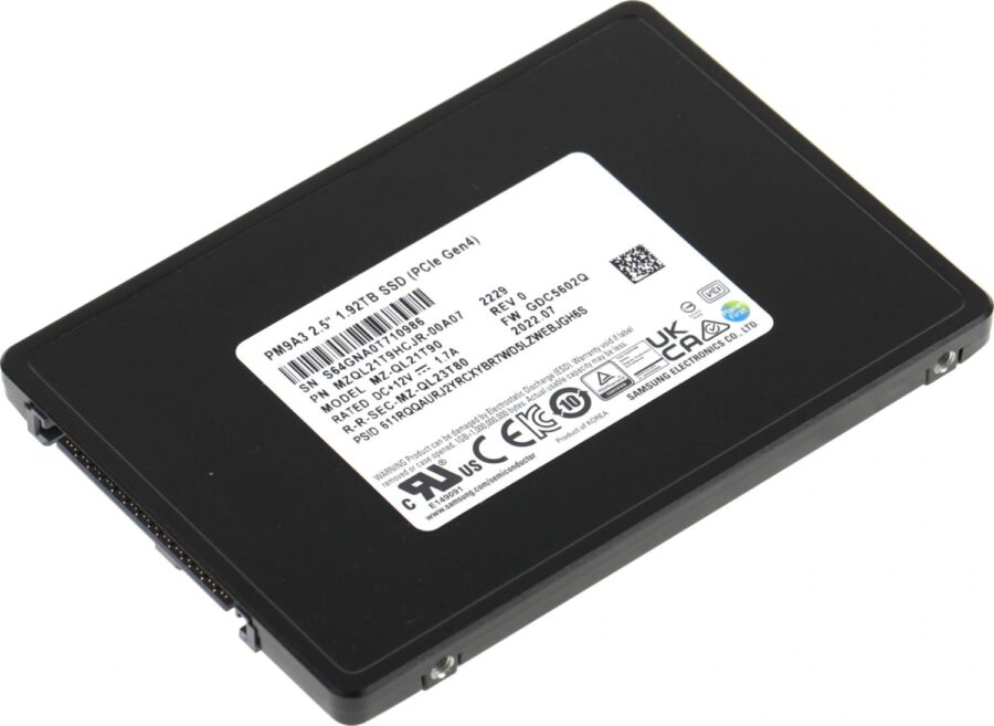 Накопитель SSD Samsung PCIe 4.0 x4 емкостью 1920 Гбайт, модель MZQL21T9HCJR-00A07 серии PM9A3, представляет собой высокопроизводительное решение для серверных систем и рабочих станций, требующих максимальной скорости обработки данных и надежности. Оснащённый интерфейсом PCIe 4.0 x4 с поддержкой протокола NVMe, этот накопитель гарантирует инфраскоростную передачу информации, обеспечивая пропускную способность до 7,877 МБ/с по внешней скорости передачи данных.