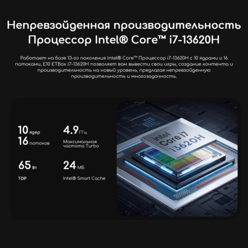 Неттоп Acer Gadget E10 ETBox i7 13620H представляет собой высокопроизводительный компактный компьютер, идеально подходящий для решения широкого спектра задач в офисе, домашнем использовании и профессиональной сфере. Оснащённый мощным процессором Intel Core i7 13620H с тактовой частотой до 2.4 ГГц, данный неттоп обеспечивает высокую производительность при выполнении ресурсоёмких приложений и многозадачности.