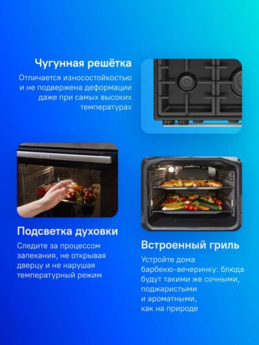 Данная модель оснащена прочной стеклянной крышкой, которая служит дополнительной защитой панели и при закрытом состоянии увеличивает безопасность эксплуатации. Использование чугунной решётки над газовыми конфорками обеспечивает надежное размещение посуды и равномерное распределение тепла, что способствует качественному приготовлению блюд.