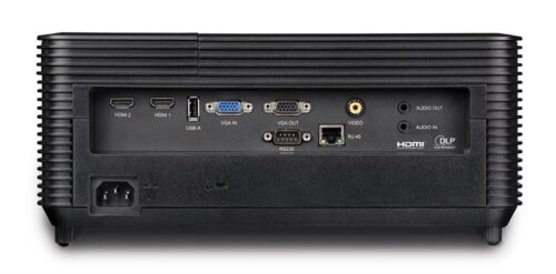 Функция подключения периферийных устройств реализована через USB Type-A порт, который поддерживает работу с клавиатурами и мышами, облегчая управление презентациями и настройками проектора. Порт RS232 и разъем RJ45 обеспечивают интеграцию устройства в системы управления, что актуально для крупных инсталляций и автоматизации аудиторий.
