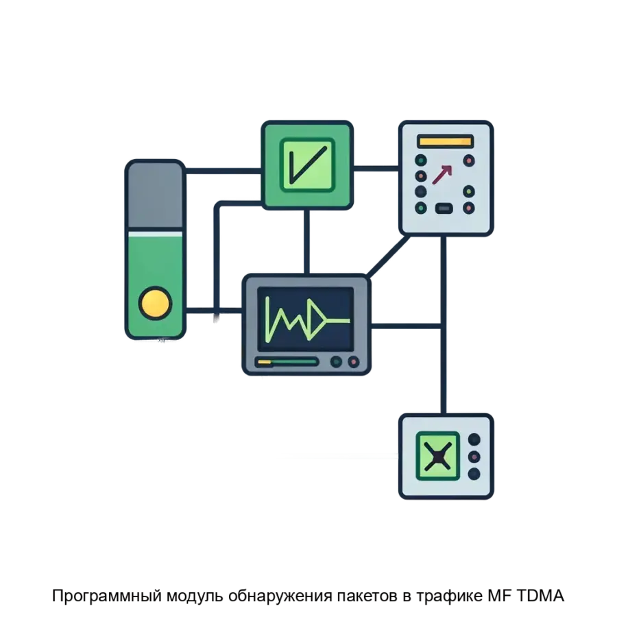 Программный модуль обнаружения пакетов в трафике MF TDMA предназначен для анализа сигналов в спутниковых сетях с использованием метода обнаружения пакетов в тайм-слотах. Этот модуль обеспечивает точную синхронизацию с временными метками тайм-слотов, что является ключевым для правильной декодировки и анализа данных. Он осуществляет обработку сигнала каждого тайм-слота, что позволяет выделять границы пакетов и обеспечивать высокую точность определения начала пакета, что критично в условиях спутниковой связи с высокой задержкой.