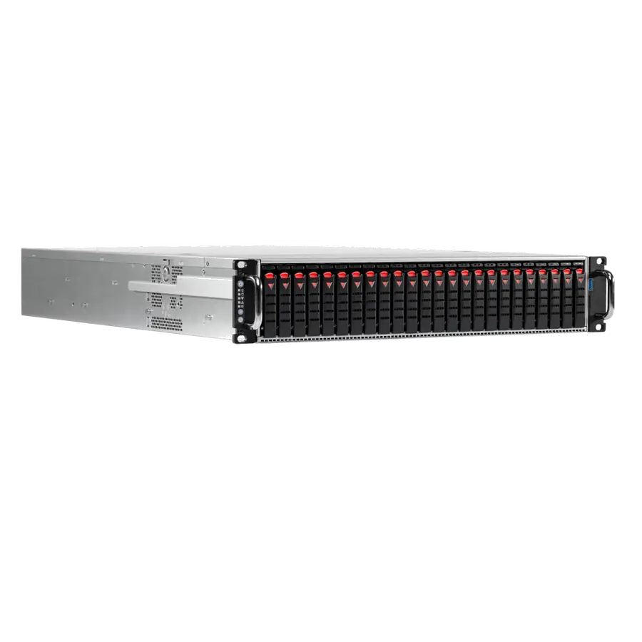 24 слота с горячей заменой для установки высокопроизводительных накопителей с SAS интерфейсом и подключением через SAS экспандер не требующие использования многоканального дискового контроллера.