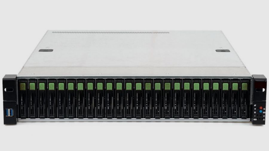 Для хранения данных сервер предусматривает до 24 слотов формата SFF (2,5 дюйма) на лицевой панели, что позволяет создавать вместительные и быстрые массивы хранения информации. В серверной конфигурации установлены два блока питания с поддержкой горячей замены, что способствует минимизации времени простоя и повышает надежность системы. Размер и форм-фактор позволяют монтаж в стойку, занимая всего два юнита в стандартной стойке 19 дюймов.