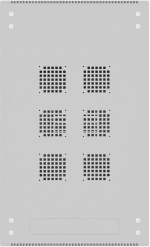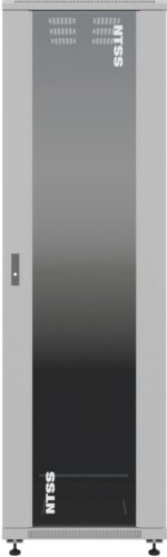 Основной материал шкафа — сталь с порошковым покрытием серого цвета RAL 7035, что обеспечивает защиту от коррозии и механических повреждений. Передняя дверь шкафа одностворчатая, выполнена из закалённого стекла, что обеспечивает визуальный контроль оборудования без необходимости открывать шкаф. Задняя дверь изготовлена из металла, что повышает безопасность и устойчивость конструкции. Съемные боковые панели обеспечивают удобный доступ к внутреннему пространству для монтажа и обслуживания оборудования.