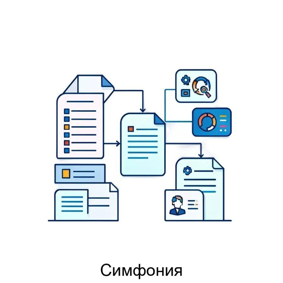 Симфония представляет собой платформу интеллектуального управления контентом и цифровизации бизнес-процессов, объединяющую функции систем управления документами (ЕСМ), систем управления контентом (CSP) и бизнес-процессами (BPM). Платформа разработана для создания единого цифрового пространства, обеспечивая эффективное хранение цифрового контента в едином репозитории и предлагая замену западным решениям без потери функционала.