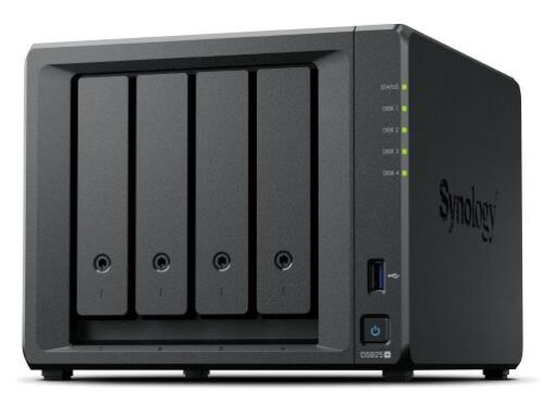 Корпус системы рассчитан на 4 стандартных отсека под жесткие диски SATA форм-фактора 3,5″ или 2,5″, с возможностью расширения до 9 отсеков при использовании одного модуля Synology DX525, что позволяет масштабировать емкость по мере роста потребностей. Дополнительно предусмотрены два слота для NVMe M.2 накопителей, которые могут быть использованы для кэширования данных, что существенно улучшает общую производительность системы при интенсивной работе с файлами.