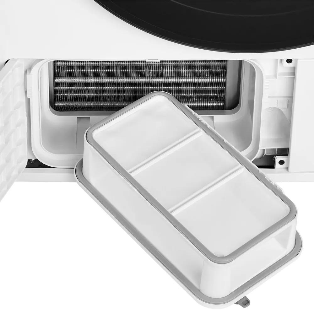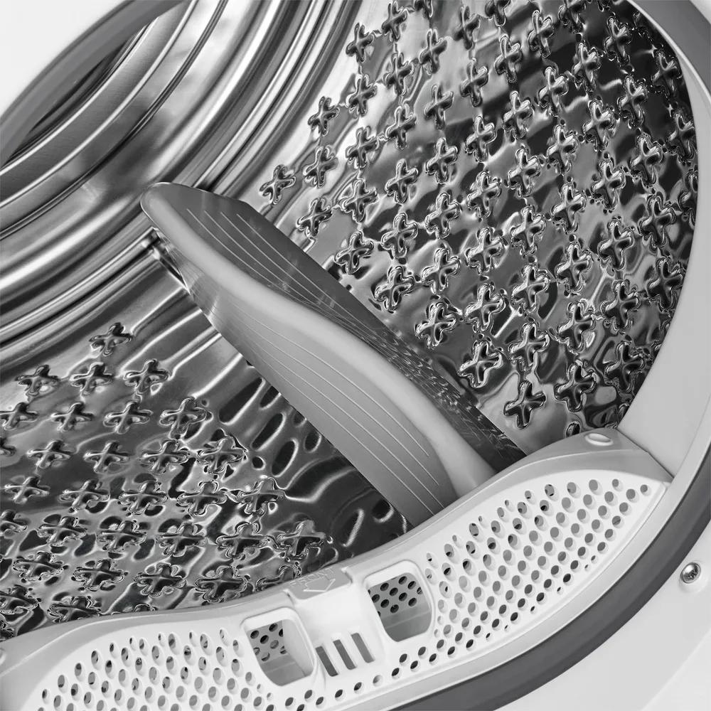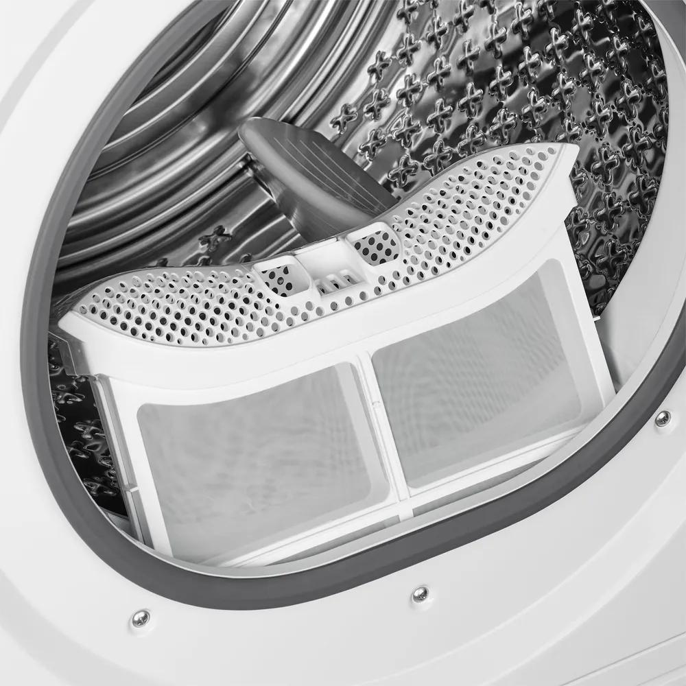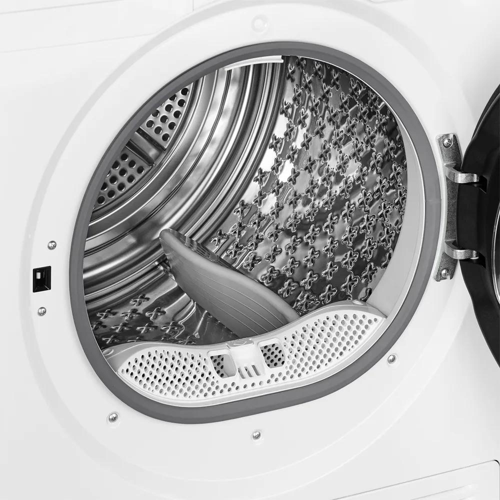 Барабан выполнен из нержавеющей стали, что гарантирует его долговечность и надежность в использовании. Внутренний объем позволяет загружать максимум 10 кг белья за один цикл, что удобно для больших семей и при необходимости быстрого высушивания большого количества одежды. Диаметр загрузочного люка — 340 мм, а общий диаметр равен 576 мм — это обеспечивает легкий доступ к барабану и удобство загрузки и выгрузки.